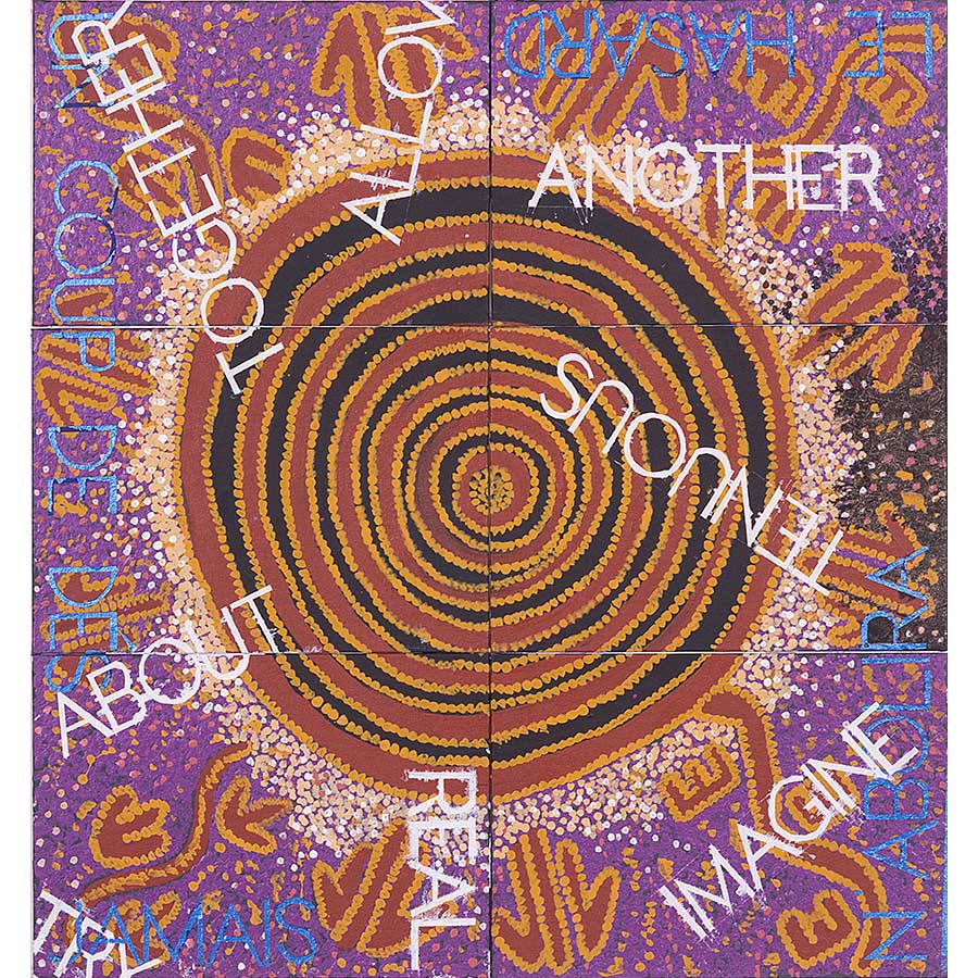 Originally, seven collaborative canvas board works were planned. ‘Chapter One’ culminated in the momentous 2008 Fatherland. This was soon followed by ‘Chapter Two’, with an additional six works, closing in 2012 with The Loaded Ground (Drill Hall ANU Canberra exhibition and associated publication) featuring the momentous 165 canvas board work Hymn to the Night. ‘Chapter Three’ includes The Messenger, a 64-panel square format work, which featured in the exhibition Meeting Place at Parliament House Gallery, August-November 2017, with this work being subsequently acquired by APH Art Collection.