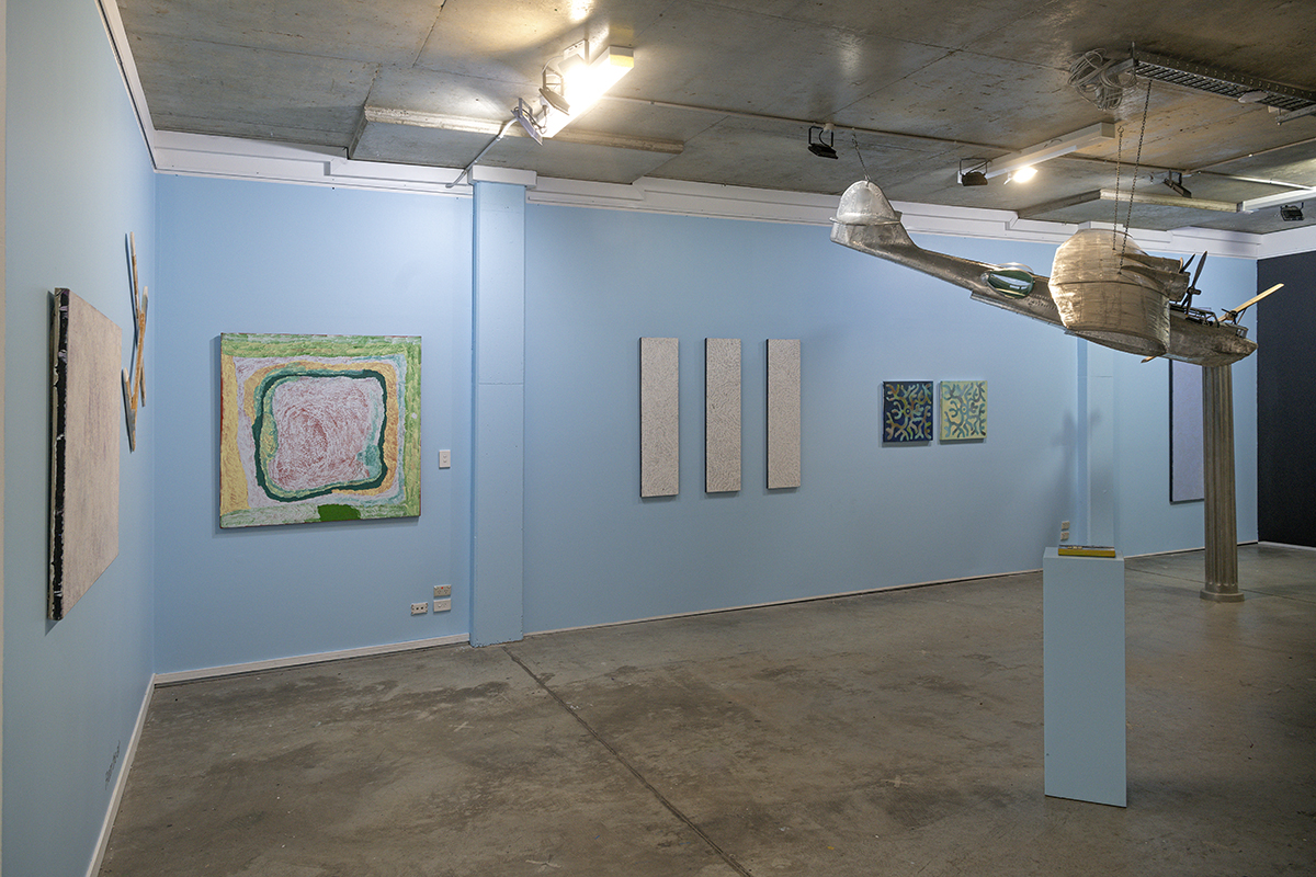 In From the air, Stephen Hart’s suspended sculpture of a Catalina aircraft flies over an entire continent of Aboriginal art, from the east coast, through to the Central Desert and the Western Australian Coast. Bidyadanga artist Lydia Balbal’s Untitled painting depicts the course of a subterranean water stream, reaching for the roots of thousand-year-old myths and landscapes by going beyond the visible surface of things.