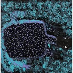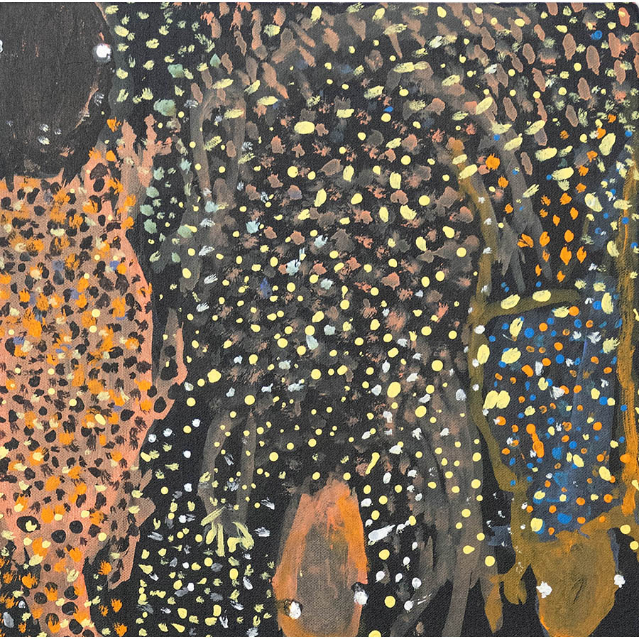 The works by Maruku Artists are stories of the land and ancestral spirits or ‘Tjukurpa’ channeled onto canvas and wood. Included are paintings by Reggie Uluru who narrates the story of ‘Wati Ngintaka’ (Perentie Lizard Man). Sandy Willie paints ancestral country and sacred men’s law around Kaltukatjara. With raw material from Country and pyrography, Billy and Lulu Cooley showcase a series of ‘Punu’ (woodcarvings) and ‘Kali’ (boomerangs). Veronica Reid is an experienced artist who depicts her country and her father’s Tjukurpa using bright and vibrant colours. Veronica and Miles have collaborated on the work titled ‘Desert Stories’.