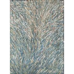 Barbara’s Grass seed paintings are visually quite different to that of both her mother & daughter. Her evocative painting style captures the movement of a breeze through the grasslands. Subtle choices of melding colours create an invigorating yet tranquil glimpse of desert terrain. The work of Charmaine Pwerle proudly echoes her grandmother’s - both wholeheartedly focusing on Awelye, the women’s body-paint design. These energetic, gestural markings reflect the traditional body paint adorned by women during their ceremonies. Whilst both styles are festive & playful, Minnie’s lines were often thick & bold, while Charmaine employs a thinner stroke with the occasional use of dotting.