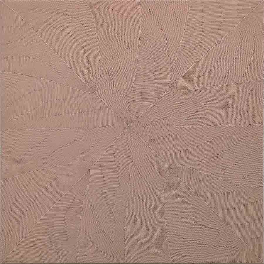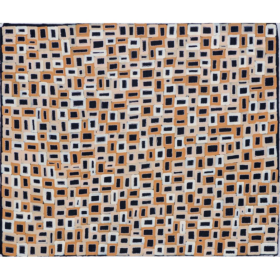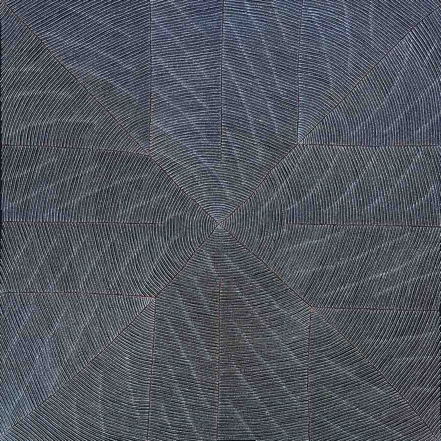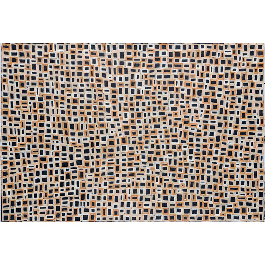 Margaret Loy Pula uses a refined colour palette to depict her primary subject matter Anatye/ Bush Potato which is vital for her Anmatyerre people for both its spiritual significance and as a reliable food source. Pula’s visual language utilises fine dots, rhythmically applied in intricate webs to create expansive patterns that generate a calmness and wisdom seemingly drawn from nature.