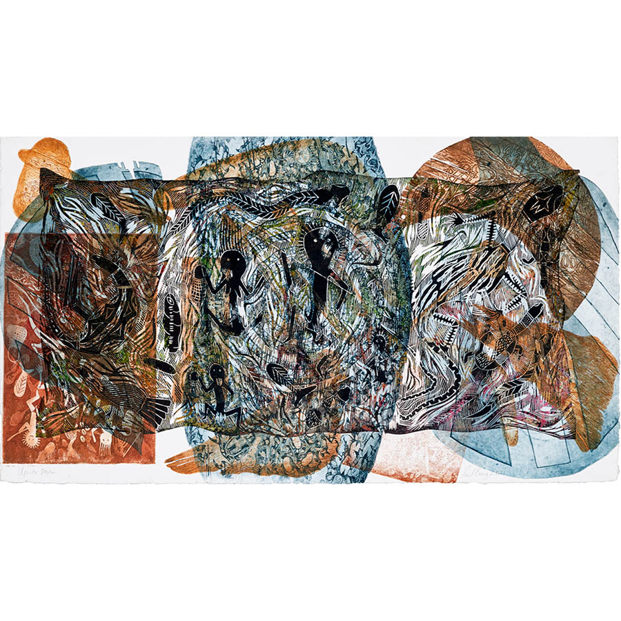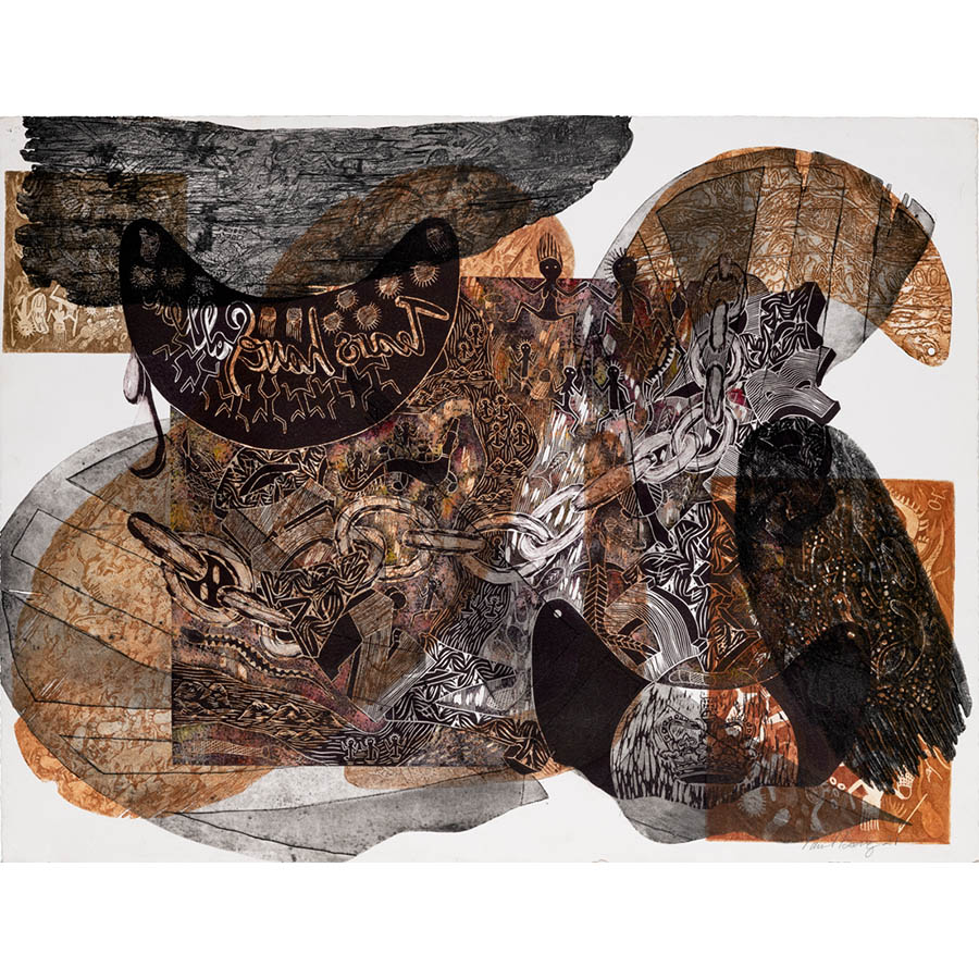 In Error of Parallax, Paul explores themes of ‘two lines of sight’ and highlights the resultant divergence of cultural perspectives amidst frontier conflicts, particularly in his Far North Qld homeland. His images of dispersed objects are like fractured mirrors. The layers are revealed in a frenzy of collaged elements moving through passages of time. This imagery includes glimpses of early colonial regalia, and weaponry, meshed with fragmented shields and artefacts - elements of a conflict that for the artist is still present. One such motif that Paul uses is Captain Cook. He comments, “Captain Cook’s arrival in 1770 wasn’t so bad, it was the mob that came afterwards that caused the problem!”