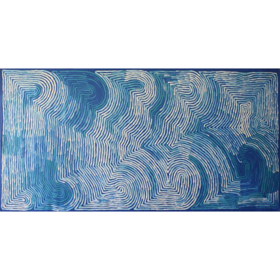 Rosella Namok, whose work is based in colour gradations to evoke the atmospherics of the Lockhart River (Cape York Peninsula), disrupts the picture plane with the strongly vertical parallel lines of the rains that dramatically impact the landscape. Eather noted, The Stinging Rain imagery has become a powerful and evocative landscape arrangement for Rosella. After layering multi-coloured, high gloss paints, she allows them to dry, and with the final wet coat she will ‘whip’ the painted surface with long thin sticks, creating the rhythmic patterns of the driving rain commonplace in the tropics. It is an action painting that brings the physicality of Namok into play.