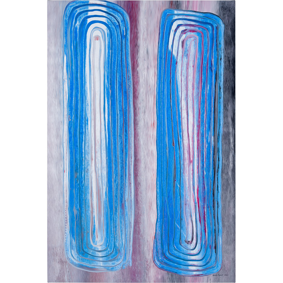 Emotional wellbeing and achieving a sense of balance has always been at the heart of Rosella Namok’s work, and continues to play out in her very considered language of colour fields and tones. The Kaapay and Kuyan moieties, representing her culture’s balanced duality of clan difference in traditional culture, have featured in Rosella’s art from the onset. Whilst the moieties have a diminished role in the social life of younger generations, Rosella maintains their underlying message of a perpetual pursuit for the integration of social and personal wellbeing. Colours graduate through Rosella’s painting like musical scores as they lift and descend through fluctuating moods and emotions. There is something fundamental about human creativity in Rosella’s paintings and sculptures that tap into what was once called biorhythms or what the philosopher Carl Jung called synchronicity.