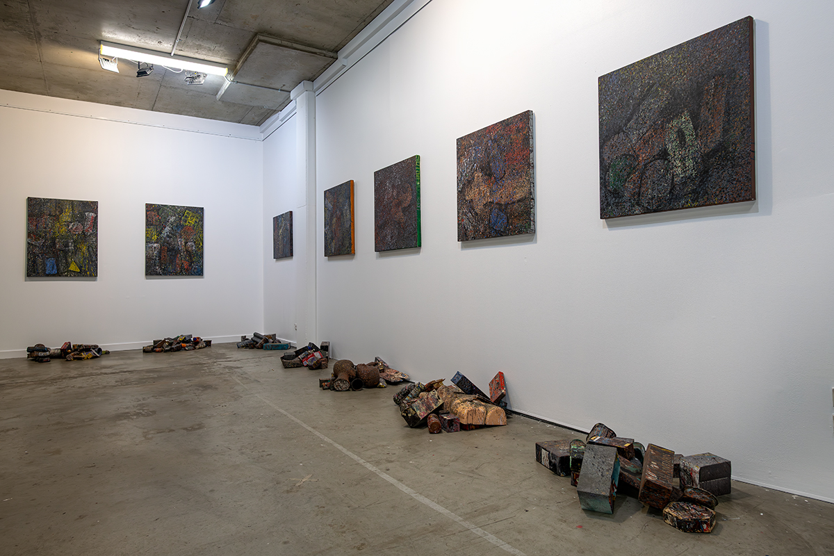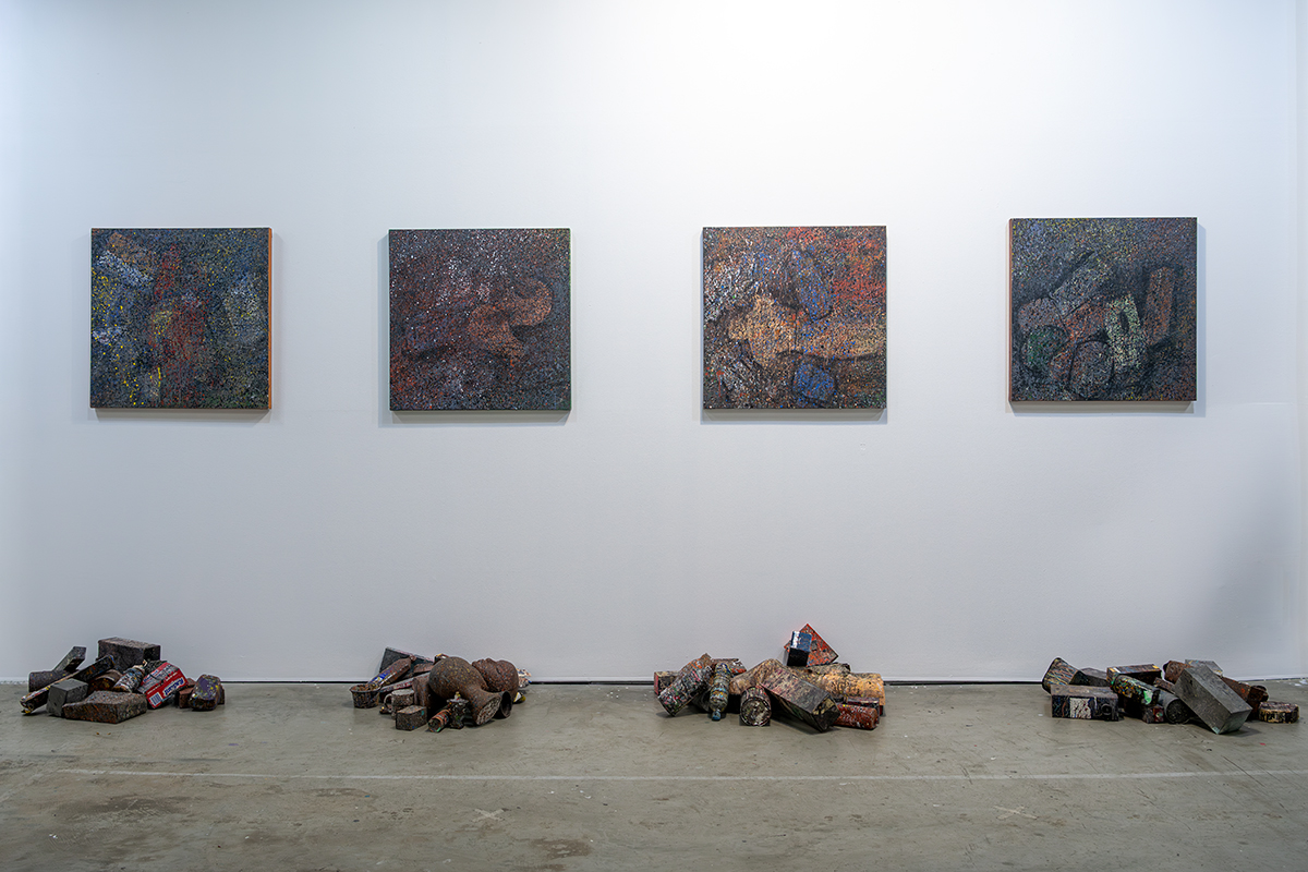 While his practice has engaged with graphic design, performance, and process art, Still Life brings this longstanding investigation into dialogue with the conventions of still life. The exhibition presents nine paintings alongside an installation of studio debris—materials oversprayed with paint and treated as integral to the work. Together, these elements collapse the boundary between artwork and residue.